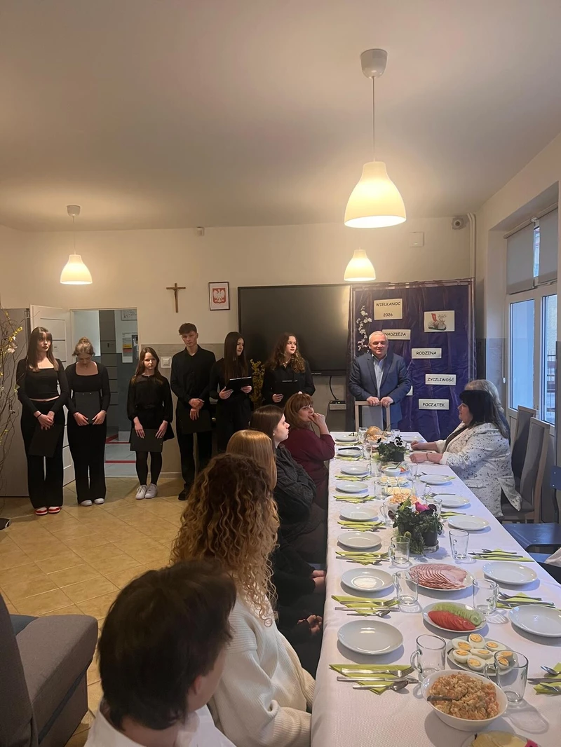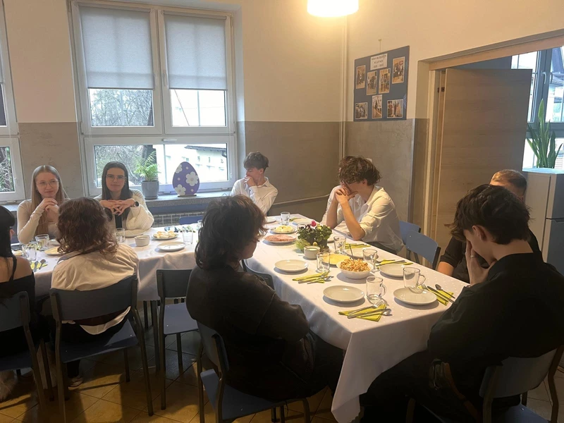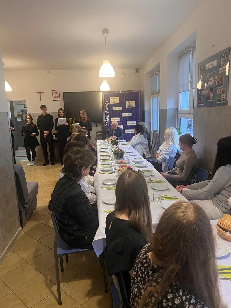 Uroczysta kolacja wielkanocna w bursie odbyła się w miłej i uroczystej atmosferze. Rozpoczęła się od serdecznych życzeń świątecznych złożonych przez Dyrektora placówki Bogusława Ptaka. Następnie uczniowie zaprezentowali krótki montaż słowno - muzyczny o tematyce świątecznej, który wprowadził zebranych w refleksyjny i radosny nastrój. Wspólnie zasiedliśmy do stołu, na którym znalazły się tradycyjne potrawy wielkanocne. Spotkanie to było nie tylko okazją do celebrowania tradycji wielkanocnych, ale także do wspólnych rozmów, integracji oraz budowania pozytywnych relacji pomiędzy mieszkańcami bursy.