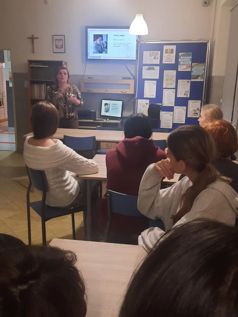 W dniu 22 października kolejny już raz odwiedziła nas p. Iwona - pracownik bocheńskiego Sanepidu. Tym razem tematem spotkania było "W zdrowym ciele zdrowy duch - profilaktyka chorób zakaźnych." Prelekcja przygotowana w ciekawej formie, poparta slajdami bardzo podobała się młodzieży. Jeszcze raz bardzo dziękujemy za spotkanie.